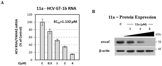 Chronic hepatitis C virus (HCV) infections are a worldwide medical problem responsible for diverse types of liver diseases. The NS5B polymerase enzyme has become a very interesting target for the development of anti-HCV drugs owing to its fundamental role in viral replication. Here we report the synthesis of a novel series of 1-substituted phenyl-4(1H)-quinazolinone and 2-methyl-1-substituted phenyl-4(1H)-quinazolinone derivatives and evaluate their activity against HCV in HCV subgenomic replicon assays. The biological data revealed that compound 11a showed the highest activity against HCV GT1b at a micromolar concentration (EC50 = 0.984 µM) followed by compound 11b (EC50 = 1.38 µM). Both compounds 11a and 11b had high selectivity indices (SI = CC50/EC50), 160.71 and 71.75, respectively, which make them very interesting candidates for further development of more potent and selective anti-HCV agents.