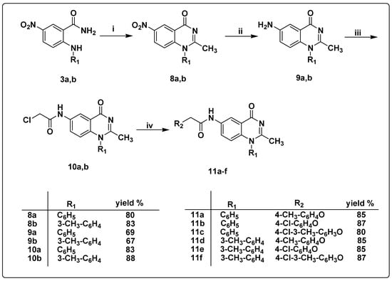 • General procedure for the synthesis of 2-substituted phenoxy-N-[2-methyl-4-oxo-1-(substituted phenyl)-1,4-dihydro quinazolin-6-yl]acetamide (11a–f).