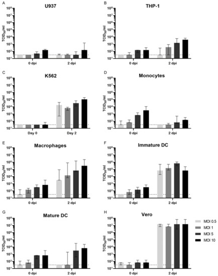 - Michlmayr, D.; Andrade, P.; Gonzalez, K.; Balmaseda, A.; Harris, E. CD14(+)CD16(+) monocytes are the main target of Zika virus infection in peripheral blood mononuclear cells in a paediatric study in Nicaragua. Nat. Microbiol. 2017, 2, 1462–1470. [Google Scholar] [CrossRef] [PubMed]