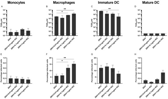 - Carlin, A.F.; Vizcarra, E.A.; Branche, E.; Viramontes, K.M.; Suarez-Amaran, L.; Ley, K.; Heinz, S.; Benner, C.; Shresta, S.; Glass, C.K. Deconvolution of pro- and antiviral genomic responses in Zika virus-infected and bystander macrophages. Proc. Natl. Acad. Sci. USA 2018, 115, E9172–E9181. [Google Scholar] [CrossRef]