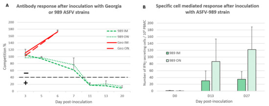 3.3. Development of ASFV-Specific Immune Response after Inoculation with Georgia or ASFV-989 Strains