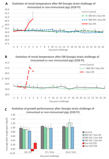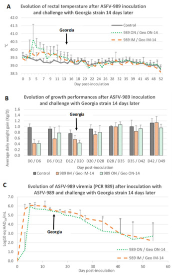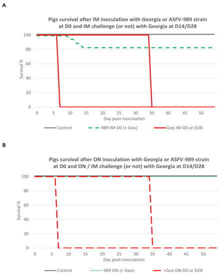 3.5. Protective Effect of ASFV-989 Strain Inoculation against a Challenge with the Georgia Strain Occurring 2 Weeks Later