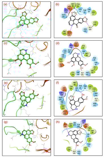 3D representation of SARS-CoV-2 docked complexes exhibiting intermolecular interactions with potential compounds; (a,b) Cassameridine, (c,d) Laetanine, (e,f) Litseferine, and (g,h) Cassythicine. Docked complexes with the active residues of the viral protease have been shown in a 2D interaction diagram as hydrogen bond formation (pink arrows), π-π interactions (green lines), hydrophobic (green), polar (blue), red (negative), violet (positive), and glycine (grey) interactions.