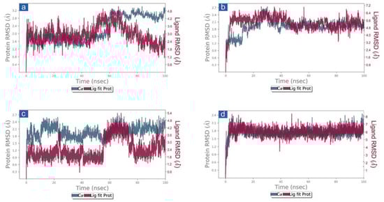Molecular dynamics simulation (MDS) is a computative approach used to discover new drug lines to monitor the stability of molecular docked complexes over time [43,44]. In this study, root mean square deviation (RMSD) and root square mean fluctuation (RMSF) retrieved from corresponding 100 ns simulation trajectories were used to assess the stability of selected complexes. Usually, the structural variations necessary to determine the system’s dynamic stability are observed using RMSD and RMSF. To examine the stability of docked ligands at the active pocket of viral protease, intermolecular interactions between the protein and ligands were also estimated from the respective 100 ns simulation trajectories.