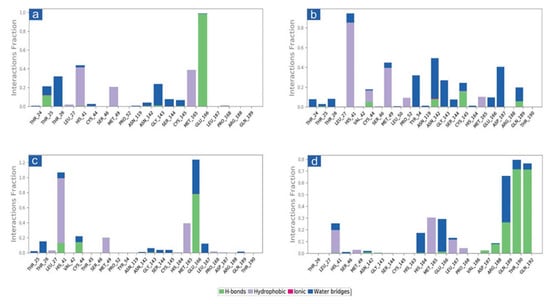 Protein-ligand interactions mapping for SARS-CoV-2 docked with potential compounds, i.e., (a) Cassameridine, (b) Laetanine, (c) Litseferine, and (d) Cassythicine, extracted from 100 ns MD simulations. Herein, values of interaction fractions >1.0 are feasible as some residues established several interactions of the similar subtype.