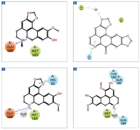Schematic representation for docked protein-ligand complexes, viz. (a) Cassameridine, (b) Laetanine, (c) Litseferine, and (d) Cassythicine, interaction profile extracted at 30% of total 100 ns simulation interval.