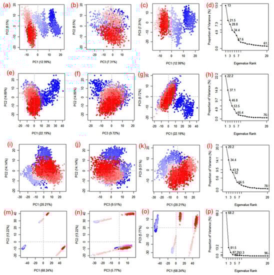 PCA analysis of SARS-CoV-2 docked simulated MD trajectories with cassameridine (a–d), laetanine (e–h), litseferine (i–l), and cassythicine (m–p). Each direction’s logged deviations in the residue location are categorised by the analogous eigenvalue’s total percentage of mean square displacements (PCs). Periodic jumps between the structural conformations taken from the 100 ns simulation trajectories are visible in the continuous colour change from blue to white to red.
