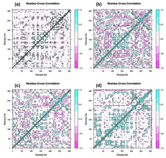 Dynamic cross correlation for Tyrosinase complexed with (a) Cassameridine, (b) Laetanine, (c) Litseferine, and (d) Cassythicine, (Note Residues labels are numbered from 1–306 as in crystal structure). During a 100 ns simulation interval, the movement of residues exhibits a positive correlation in cyan colour and a negative correlation in cyan red.