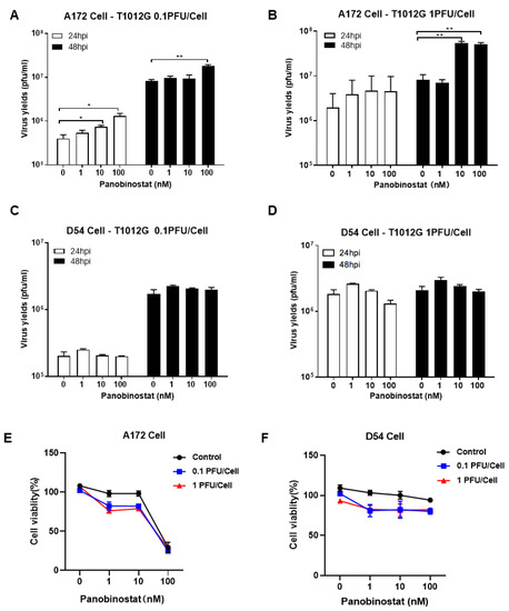 The HDACi panobinostat promoted oHSV replication and tumor-cell killing in human glioma A172 cells. Human glioma cells A172 (A,B) and D54 (C,D) were pretreated with panobinostat at concentrations of 1, 10, and 100 nM for 14 h and then infected with T1012G (0.1 or 1 PFU/Cell) for another 48 h, respectively. The infected cell pellets were harvested at 48 hpi. The titration was measured by conventional plaque assay on Vero cells after three freeze–thaw cycles. The tumor-cell-killing activity was assessed using a CCK8 assay. A172 (E) and D54 (F) cells were mock- or pretreated with panobinostat at different concentrations as above for 14 h and then infected with T1012G at an indicated MOI for 48 h. The cell viability of the infected cells was measured with a CCK8 assay (mean ± SD). The assay was performed in triplicate. Differences between datasets were assessed by Student’s t-test (two-tailed) using GraphPad Prism software. * p < 0.05 and ** p < 0.01.