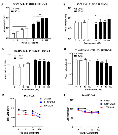 Panobinostat treatment facilitated oHSV replication and tumor cytotoxicity in human squamous cell carcinoma SCC9 cells. Human squamous cell carcinoma SCC9 (A,B) and Tca8113 cells (C,D) were pretreated with panobinostat (1, 10, or 100 nM) for 14 h and then infected with T1012G (0.1 or 1 PFU/Cell) for another 48 h, respectively. The infected cell pellets were harvested at 48 hpi. The titration was measured by conventional plaque assay on Vero cells after three freeze–thaw cycles. The cytotoxicity activity was assessed using a CCK8 assay. SCC9 (E) and Tca8113 (F) cells were mock- or pretreated with panobinostat as above, following infection with T1012G for 48 h. The cell viability of the infected cells was measured with a CCK8 assay (mean ± SD). The assay was performed in triplicate. Differences between datasets were assessed by Student’s t-test (two-tailed) using GraphPad Prism software. * p < 0.05 and ** p < 0.01.