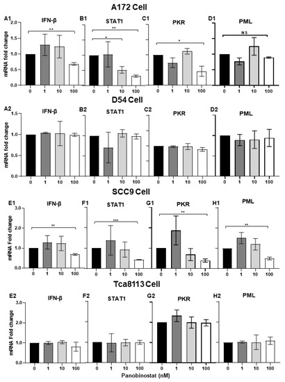 Downregulation of IFN-β- and IFN-stimulated antiviral genes when treated with panobinostat in human glioma and squamous cell carcinoma cells. A172 (A1,B1,C1,D1), D54 (A2,B2,C2,D2), SCC9 (E1,F1,G1,H1), or Tca8113 (E2,F2,G2,H2) cells were mock-treated or treated with panobinostat at different concentrations of 1, 10, or 100 nM for 14 h, respectively. Then, the cell pellets were harvested and total RNAs were extracted and reverse-transcribed to cDNA as described in the Materials and Methods section. The IFN-β, STAT1, PKR, and PML mRNAs were quantified and normalized with respect to 18S rRNA and are shown as fold changes compared to the mRNAs from the mock-treated and infected cells. Differences between datasets were assessed by Student’s t-test (two-tailed) using GraphPad Prism software. NS p >0.05, * p < 0.05, ** p < 0.01, *** p < 0.001.