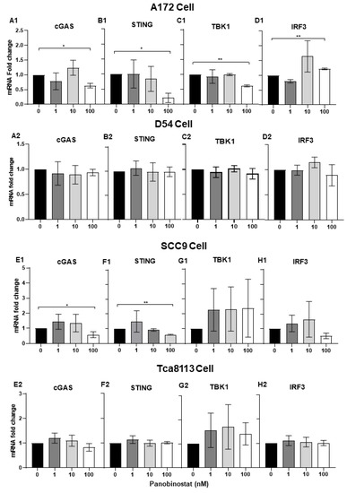 Suppression of the transcriptional expression of cGAS/STING in human glioma and squamous cell carcinoma cells when treated with panobinostat. A172 (A1,B1,C1,D1), D54 (A2,B2,C2,D2), SCC9 (E1,F1,G1,H1), or Tca8113 (E2,F2,G2,H2) cells were mock-treated or treated with panobinostat at different concentrations of 1, 10, or 100 nM for 14 h, respectively. Then, the cell pellets were harvested and total RNAs were extracted and reverse-transcribed to cDNA as described in the Materials and Methods section. cGAS, STING, TBK1, and IRF3 were quantified and normalized with respect to 18S rRNA and shown as fold changes. Differences between datasets were assessed by Student’s t-test (two-tailed) using GraphPad Prism software. * p < 0.05, ** p < 0.01.