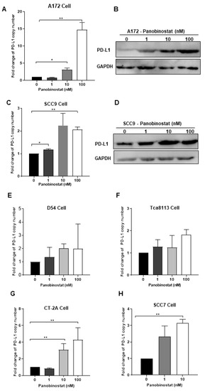 Panobinostat treatment upregulated the PD-L1 expression in glioma and squamous cell carcinoma cells. A172 (A,B), SCC9 (C,D), D54 (E), Tca8113 (F), CT-2A (G), or SCC7 (H) cells were mock-treated or treated with panobinostat at different concentrations of 1, 10, or 100 nM for 14 h, respectively. Then, the cell pellets were harvested. For each condition, half of the cell pellets were used for total RNA extraction, following reverse transcription to cDNA. The other half of the cell pellets were lysed and used for Western blot (WB) as described in the Materials and Methods section. The assay was performed in triplicate. Differences between datasets were assessed by Student’s t-test (two-tailed) using GraphPad Prism software. * p < 0.05, ** p < 0.01.