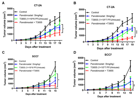 As shown in Figure 6A,B, delayed tumor growth of CT-2A was observed with panobinostat alone and oHSV T3855 alone, while combined treatment was associated with a significant decrease in tumor volume compared to oHSV T3855 alone at 1 × 106 GPFU/mouse (p < 0.05) or 1 × 107 PFU/mouse (p < 0.001). For murine squamous cell carcinoma SCC7, similarly to CT-2A, combined treatment showed an obvious decrease in tumor growth compared to oHSV alone at 1 × 106 PFU/mouse (p < 0.05) or 1 × 107 PFU/mouse (p < 0.01) (Figure 6C,D). Furthermore, during combination therapy with 1 × 107 PFU/mouse of oHSV, three of the eight mice showed a complete response in the SCC7 model after 15 days’ treatment (Table S2). This suggests that in both the CT-2A and SCC7 models, a higher concentration of oHSV displayed enhanced antitumor therapeutic activity compared to a lower concentration of oHSV, and combined panobinostat treatment with oHSV further amplified the anti-tumor therapeutic effect.