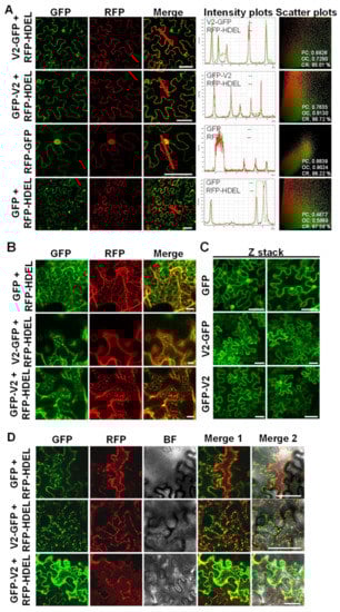 In TYLCV, the V2 protein has been described as a strong viral silencing suppressor [19,20,21,22] and as potentially involved in viral movement [35], although this is controversial [36]. A recent study has also attributed to V2 a role in the nuclear export of the CP [23]. Intriguingly, V2 has been described as localized in the endoplasmic reticulum in tobacco protoplasts [18]; however, this localization does not seem related to the protein’s previously described functions, and, therefore, its biological relevance remains unknown. In order to determine whether this localization can also be observed upon transient expression in N. benthamiana, our usual model plant in the study of plant–TYCLV interactions, we observed transiently transformed N. benthamiana leaf patches co-expressing GFP-V2 or V2-GFP [24] and the ER marker RFP-HDEL [31]. As shown in Figure 1A–D, confocal microscopy and co-localization analyses confirm that V2 fused to GFP at the N- or the C-terminus accumulates partially associated to the ER in N. benthamiana. In maximum intensity projection views from z-stacks images, it becomes apparent that V2 accumulates in the cell in a pattern different to that of free GFP, including around the nuclei (Figure 1C, Supplementary Movies S1–S6). Plasmolysis assays confirm the localization of V2-GFP and GFP-V2 inside the cell (Figure 1D). Plants expressing free GFP or RFP-fused GFP were used as a negative control or positive control in co-localization experiments, respectively (Figure 1A–D).
