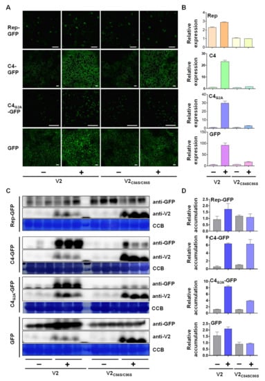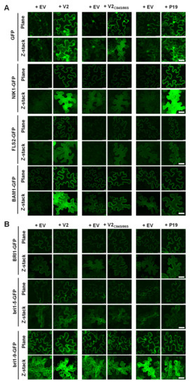 Constructs to express GFP, V2-GFP, GFP-V2, Rep-GFP, C4-GFP, C4G2A-GFP, p19, BAM1-GFP, FLS2-GFP, or NIK1-GFP have been previously described [24,25,26,27].