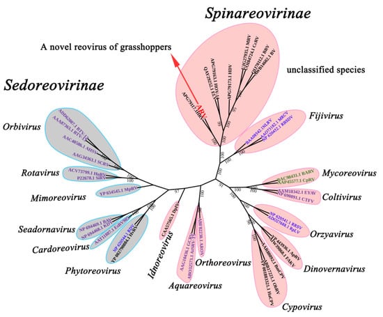 RdRp sequences of the reovirus can be successfully amplified from field-collected samples from these four species. Reovirus RdRp of grasshoppers only shared a 30% amino acid (aa) identity with its most closely related RdRp sequence of Hubei reo-like virus 1. A reovirus of grasshoppers can be considered a novel insect-specific virus based on ICTV species demarcation criteria (https://talk.ictvonline.org/ictv-reports, accessed on 1 June 2022). Considering the host origin of the virus, this novel reovirus was named Acrididae reovirus (ARV).