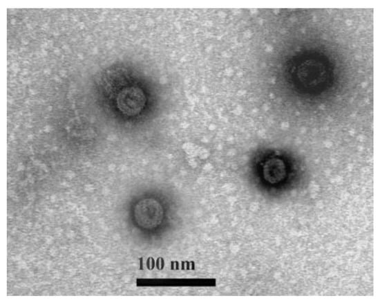 Twenty microliters of viral particles were dispensed on carbon-coated copper grids for 5 min, washed, and negatively stained with 3% phosphotungstic acid (Solarbio, Beijing, China). Virions were imaged by a Hitachi H-7500 transmission electron microscope (Hitachi High-Technologies, Tokyo, Japan).