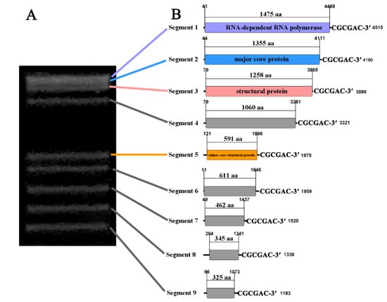 The complete genome of Acrididae reovirus (ARV). (A) Agarose gel electrophoresis of dsRNAs isolated from ARV virions. (B) Genomic organization of nine dsRNA segments of ARV. Five segments with no known homologs are indicated in grey.
