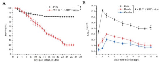 Survival and virus load of ARV-infected locusts. (A) The survival rate of ARV-infected locusts. Extremely significant differences were indicated by three asterisks (***, p < 0.001). Six replicates with twenty-five nymphs for each inoculation were generated. (B) The virus loads of the guts, heads, and ovaries at different time points. The viral load of a mixture of fifteen individuals was quantified at each time. Experiments were repeated five times.