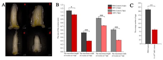 We observed an obvious pathogenic effect of ARV on the development of ovaries. The size of the ovaries of infected locusts was significantly reduced (Figure 5A). The sizes of the ovaries of uninfected adults were 1.138 × 0.528 cm and 0.932 × 0.611 cm at 4 and 7 dpi, respectively, while the ovaries of infected adults at 4 and 7 dpi were 1.026 × 0.300 cm and 0.723 × 0.322 cm (Figure 5B). The replication of ARV in infected locusts produced a characteristic porcelain-white color for the ovaries, which may result from the decrease in vitellin in the ovaries (Figure 5A). Moreover, the number of eggs laid by infected locusts was significantly lower than that of uninfected locusts (Figure 5C).