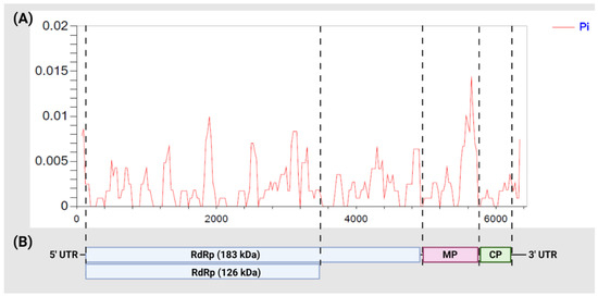 (A) Nucleotide diversity (π) distribution across all tomato brown rugose fruit virus (ToBRFV) isolates sequenced in this study. The y-axis and the x-axis represent π and the nucleotide position, respectively. (B) Genome organization of ToBRFV. RdRp: RNA-dependent RNA polymerase; MP: movement protein; CP: coat protein; UTR: untranslated region.