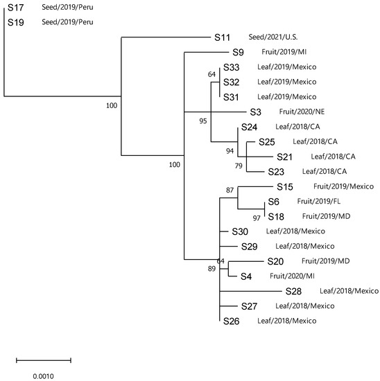 Phylogenetic analysis of the sequenced isolates, which include local, foreign, and intercepted (n = 22), for ToBRFV genomes without the UTR ends showed similar branching and structure (Figure 2). The maximum-likelihood tree showed that most isolates grouped into one clade with high bootstrap support (>90) (Figure 2). Furthermore, isolates showed structure with respect to sample type (i.e., seed, leaf, or fruit). Isolates (S11, S17, S19) from seeds were distantly related to the other isolates collected from leaves or fruits with strong bootstrap support (Figure 2). All other isolates branched in three subclades, one clade containing only one isolate from seed and two others containing isolates from fruits and leaves and from local (U.S.) and foreign (Mexico) localities.