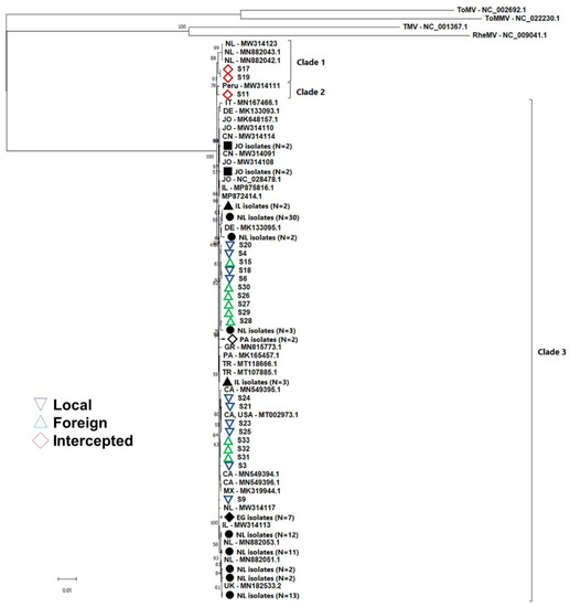 - Salem, N.; Mansour, A.; Ciuffo, M.; Falk, B.W.; Turina, M. A new tobamovirus infecting tomato crops in Jordan. Arch. Virol. 2016, 161, 503–506. [Google Scholar] [CrossRef] [PubMed]