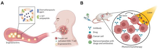 Application of extrasellar vesicles (EVs) in cancer vaccine (A) and nanocomposites in photoimmunotherapy (B).