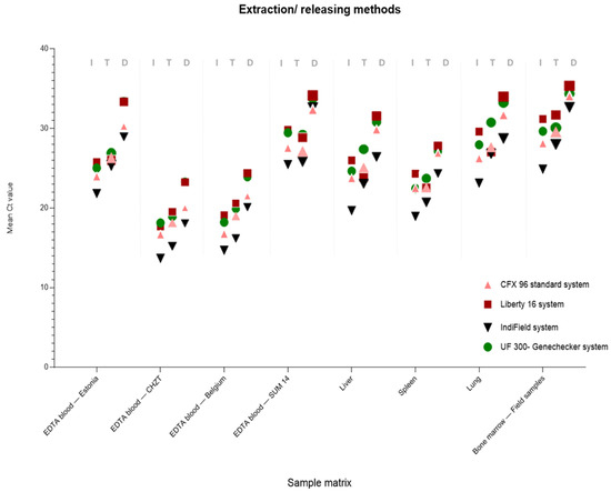 Comparison of the four different qPCR systems based on the three different extraction/releasing procedures. (I = standard automated IndiMag 48 extraction system; T = TripleE manual extraction system; D = released DNA amplified via direct qPCR). For the analyses, the qPCR results of different sample matrices from 22 animals, infected with several ASF virus strains, were used (see detailed information in the Methods and Materials section).