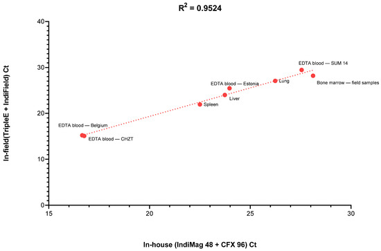 Comparison of the mean Ct values obtained from the same samples tested on the portable in-field system (TripleE + IndiField PCR system) versus the standard laboratory-based system (IndiMag 48 + CFX 96 PCR system). A Spearman correlation coefficient test was performed using GraphPad Prism 8 (GraphPad Software Inc., San Diego, CA, USA).
