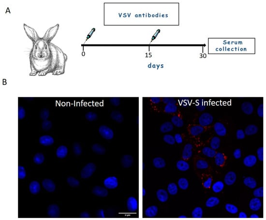 (A) Generation of rabbit serum antibodies. Rabbits were immunized with wild type-VSV (day 0) and at day 15 post prime injection, the rabbits were boosted with a similar dose subcutaneously. Serum was collected 15 days post boost. (B) Cells were either mock or VSV-S infected and then processed for immuno-florescence microscopy with 1:200 diluted rabbit serum antibodies. VSV proteins (Red) positive signal was visible in cytoplasm of infected cells, whereas in non-infected cells no staining of VSV proteins was seen. Nuclei of the cells are marked with blue color (DAPI). Scale bar is 20 µm.