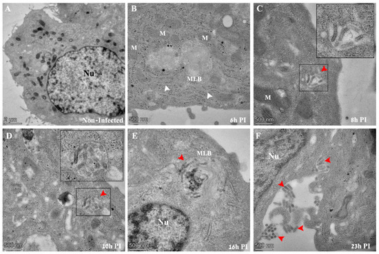 Initial morphological evidence of infection could be seen at 8 h post infection (PI), when typical “bullet like” structures appear inside vacuoles in the cytoplasm of infected cells (Figure 2C, red arrow and inset). As infection extended to later PI time points of 10, 16 and 23 h PI, virus particles were seen in cytoplasmic vacuoles, multi-lamellar bodies (MLBs) or projecting out of the outer leaflet of the plasma membrane (Figure 2D–F, red arrows). The distinction between MLB and vacuoles is based on morphological features (discussed later). No virus particles could be seen at an early time point (6 h PI) or in non-infected cells in TEM sections (Figure 2A,B).