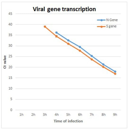 RT real-time PCR analysis results of two viral genes, nucleocapsid (N) and spike (S). Initial detection at 3–4 h post infection (PI) can be seen. As infection progresses, the reduction of Ct values suggests active viral RNA replication. The limit of detection for detection of S gene was 10 pfu/mL, and 100 pfu/mL for N gene. At 1–2 h PI, viral RNA was not detected due to low concentration below the limit of detection.