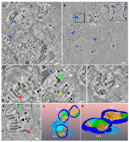 The TEM tomography results demonstrate that there is more than one VF-containing MLB per cell and that the MLBs are connected in space, generating a continuous, complex, organized network of MLBs and host membrane cisternae (Videos S1 and S2).