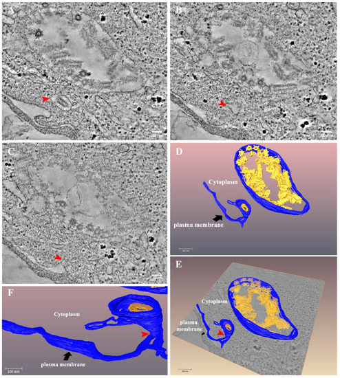 The infection cycle ends with the release of the newly formed virus particles to the extracellular space after fusion of the vacuole membrane with the plasma membrane (Figure 8 and Video S6). As shown, a large vacuole containing numerous virus particles decorated with “flask”-like projections resembling those of SARS-CoV-2 [32], most probably spike proteins, is found close to the plasma membrane. A single virus particle is seen in a neighboring vacuole (Figure 8A, red arrow), connected through a narrow membrane neck (red arrows in panels C, E, F) to the plasma membrane. This tomogram illustrates the budding process of newly formed VSV-S particles.