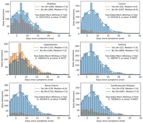 The median days of COVID-19 symptoms on hospital admission was: diabetes vs. no diabetes (7 and 7, p = 0.54), cancer vs. no cancer; (4 and 8, p < 0.001), hypertension vs. no hypertension (7 and 7, p = 0.26), asthma vs. no asthma (7 and 7, p = 0.46), chronic kidney disease vs. no chronic kidney disease (6 and 7, p < 0.001), and cardiovascular disease vs. no cardiovascular disease (7 and 7, p < 0.001).