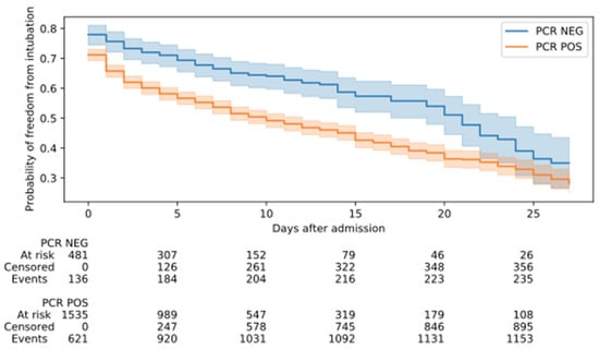 An analysis of a subgroup of patients without comorbidities that differed between the COVID-19 RT-PCR(+) and COVID-19 RT-PCR(−) was also performed. Accordingly, only patients without cardiovascular disease, diabetes, chronic kidney disease, peripheral vascular disease, cancer, and hematologic malignancy were enrolled. In this subgroup, the positive RT-PCR association with intubation (64.4% vs. 47.6%, p < 0.001, Table 7) and 28-day mortality (30.8% vs. 19.3%, p = 0.002, Table 7) was maintained.