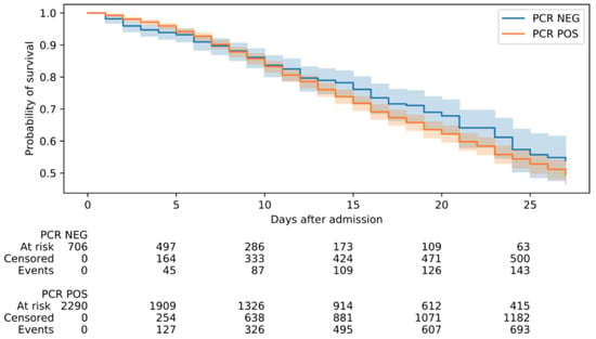 The survival probability and probability of not being submitted to intubation in the RT-PCR(+) group and RT-PCR(−) were calculated using the Kaplan–Meier method. Hazard ratio of the risk variables were estimated by fitting a Cox proportional hazards model. Afterwards, baseline factors that were associated with 28-day in-hospital mortality and intubation were identified using univariate logistic regression models. All variables that were statistically significantly associated with each outcome were then entered into separate multivariate logistic regression models. Adjusted odds ratios of mortality and intubation were calculated for each of these variables with 95% confidence intervals (CIs). Analyses were conducted using the Python frameworks statsmodels (v. 0.12.2), scikit-learn (v. 0.24.2) and lifelines (v. 0.26). Eventual missing data were set to be managed according to their nature. Values missed completely at random were addressed using complete case analysis; values missing at random were addressed using multiple imputation methods; values likely to be missing not at random will be re-evaluated by authors.