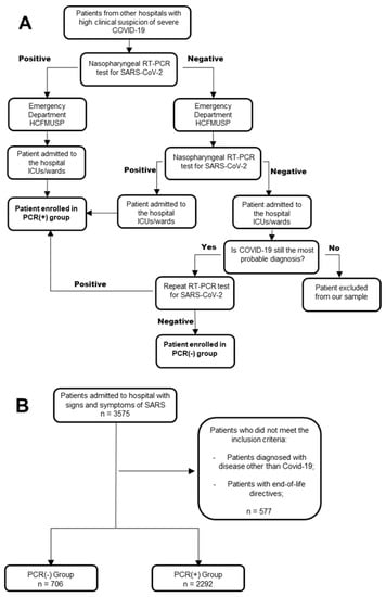 We conducted a retrospective unicentric cohort study from March to August 2020 at the Hospital das Clínicas da Universidade de São Paulo (HC-FMUSP), a 2200-bed urban, academic medical center comprising five institutes and two auxiliary hospitals. During the pandemic, the HC-FMUSP has been designated for the reception and care of patients with severe COVID-19. All patients were evaluated and treated according to the Institution’s protocol that consisted and still consists of supportive care, including supplemental oxygen and mechanical ventilatory support when indicated. By the end of July 2020, after the preliminary report from the RECOVERY Collaborative Group, patients who were receiving either invasive mechanical ventilation or oxygen alone were also treated with corticosteroids both in the COVID-19 RT-PCR(+) group and COVID-19 RT-PCR(−) group. Therefore, there were no differences in the treatment provided for both groups. There were no instances during the time-period studied when mechanical ventilation or other treatment modalities were unavailable for patients who might have needed them.