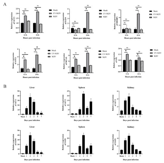 The mRNA expression levels of lipid relative genes post SGIV infected in vivo/vitro. Expression levels of lipid related genes in GS cells during SGIV infection (A). mRNA expression of ACC1 and FASN in different tissues of grouper during SGIV infection (B). n = 3, data are expressed as means ± SD, * indicates p < 0.05, ns for no significant difference.