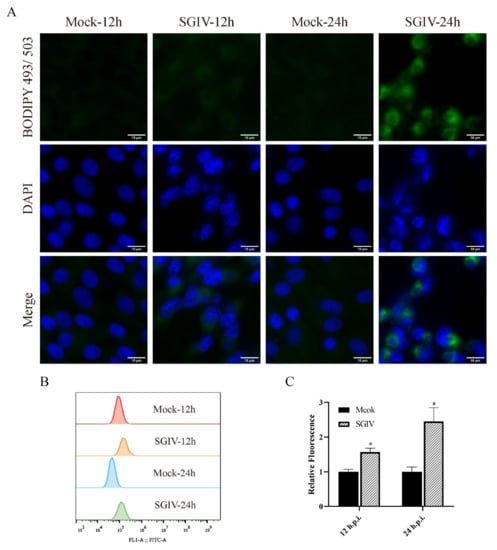 It has been demonstrated that many viruses can induce the formation of LDs that are beneficial for virus replication [22]. To determine whether the formation of LDs occurred in SGIV-infected cells, mock or infected cells were stained with BODIPY® 493/503, and the cells were observed by fluorescent microscope. As shown in Figure 2A, the detectable green fluorescent signals were increased in SGIV-infected cells (Figure 2A). In addition, they were quantitatively analyzed by flow cytometry, the relative fluorescence of infectious cells was 1.57 and 2.45 times more than that in mock infection cells at 12 and 24 h.p.i., respectively. These data suggest that SGIV infection can induce the formation of LDs.