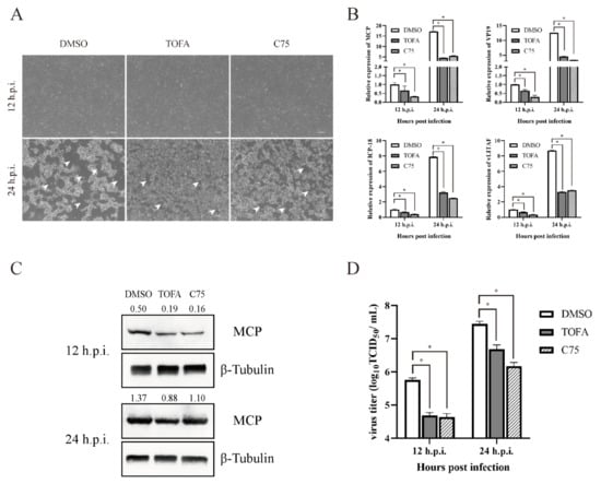Some viruses have been reported that they can manipulate the fatty acid synthesis pathway to increase the replicate efficient [5]. To assess whether fatty acid synthesis is involved in SGIV replication, we focused on ACC1 and FASN, the two most crucial restriction enzymes, and explored their roles in SGIV infection by corresponding inhibitors and specific siRNA. The concentration of inhibitors was used as described in our previous study [22]. GS cells were pretreated with TOFA and C75 for 2 h before SGIV infection, and a cytopathic effect (CPE) could be observed at 12 h post infection (h.p.i.). The CPE showed significant delays in TOFA- and C75-treated cells than in DMSO-treated cells at 24 h.p.i. (Figure 3A). Consistently, the transcription of viral genes, including MCP, VP19, ICP-18 and vLITAF, were all significantly decreased in SGIV-infected cells in the presence of TOFA or C75 (Figure 3B). The expression levels of MCP and virus production were significantly suppressed after FAs synthesis inhibitor (TOFA and C75) treatment (Figure 3C,D).