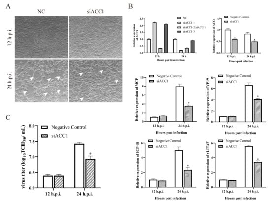 To clarify the role of ACC1 in SGIV infection, three different candidate siRNAs were designed to silence the transcription of ACC1. The siACC1-2 showed the most significant silencing effect on ACC1 expression and was designated as siACC1 in the following experiments (Figure 4B). As shown in Figure 4A, the severity of CPE induced by SGIV was obviously weakened by transfection with siACC1. Consistently, the viral gene transcription and virus production in siACC1-transfected cells were also significantly inhibited at 24 h.p.i. compared with control cells (Figure 4B,C).