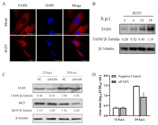 Roles of FASN during SGIV replication. Immune fluorescence detection of the FASN protein after treatment with mock and SGIV. Red fluorescence indicates FASN protein (A). Protein expression of FASN during SGIV infection (B). Effects of siRNA on SGIV MCP protein expression during SGIV infection (C). Effects of siRNA on SGIV TCID50 during SGIV infection (D). n = 3, data are expressed as means ± SD, * indicates p < 0.05.