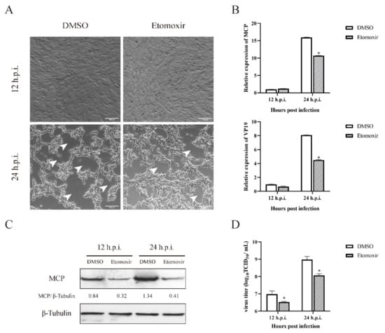 Growing evidence has demonstrated that β-oxidation exerts crucial roles during the virus life cycle. To clarify whether β-oxidation was critical for SGIV infection, GS cells were treated by etomoxir, an inhibitor of fatty acid β-oxidation, and were then infected with SGIV. As shown in Figure 6A, the CPE induced by SGIV infection was significantly reduced in etomoxir-treated cells compared with to that in DMSO-treated cells at 24 h.p.i. Moreover, viral gene transcription and protein synthesis were both significantly suppressed in etomoxir-treated cells versus DMSO-treated cells (Figure 6B,C). The results of the virus titer assay showed that the mean value of TCID50/mL was 106.98 (DMSO 12 h.p.i.), 106.53 (etomoxir 12 h.p.i.), 108.98 (DMSO 24 h.p.i.) and 108.07 (etomoxir 24 h.p.i.). Compared to the control group, the virus production in etomoxir-treated cells decreased up to 35.48% (12 h.p.i.) and 12.30% (24 h.p.i.), revealing that fatty acid β-oxidation could also decrease the virus yield (Figure 6D). These data revealed that fatty acid β-oxidation is a crucial event during SGIV replication.