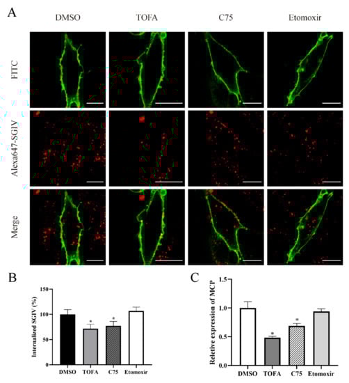 Fatty acid biosynthesis, but not β-oxidation, participates in the process of SGIV entry. TOFA and C75 inhibited SGIV entry, and the fixed cells were observed by CLSM (A,B). The mRNA relative expression of SGIV MCP was suppressed by TOFA and C75 intracellularly (C). n = 3, data are expressed as means ± SD. * indicates p < 0.05.