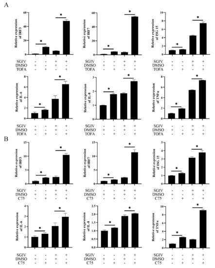 To examine the roles of fatty acid biosynthesis on host immune response against SGIV infection, GS cells were pre-incubated with TOFA or C75 and then infected by Mock/SGIV. As shown in Figure 8, the expression levels of IFN-related genes, including IRF3, IRF7 and ISG15, were significantly increased during FA synthesis inhibition (Figure 8A). Similarly, the expression levels of proinflammatory cytokines, such as IL-6, IL-8 and TNFα, were also upregulated (Figure 8B). Thus, we speculated that fatty acids exerted an essential role in host immune and proinflammatory responses during SGIV infection.