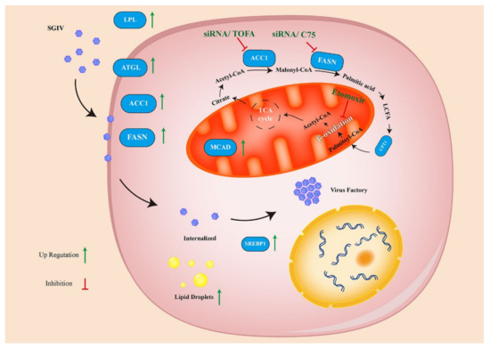 Model for the roles of de novo fatty acid biosynthesis during SGIV infection. The de novo fatty acid biosynthetic pathway was utilized through SGIV infection. Inhibition of ACC1 (converts acetyl-CoA to malonyl-CoA), FASN (catalysis malonyl CoA with acetyl-CoA to generate palmitate) and fatty acid β-oxidation significantly decreased SGIV replication. Key FAs synthesis enzymes and processes are shown in blue. Inhibitors and siRNA are shown in dark green.
