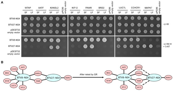 Validation of interactions between BTV-NS4 and cellular proteins. (A) Yeast cells expressing Gal4-BD alone or fused to either BTV8-NS4 or BTV27-NS4 were co-transformed with PCR products encoding cellular preys in the presence of linearized pPC86 vector to achieve recombinatorial cloning by gap-repair (GR). For each cellular prey, the shortest (SF) and longest (LF) fragments, identified in our Y2H screens, were used to retest the bait-prey combinations. -L/-W: synthetic culture medium depleted of leucine and tryptophan. -L/-W/-H + 3-AT: synthetic culture medium depleted of leucine, tryptophan, histidine + 5 mM of 3-amino-triazole to test the interaction-dependent transactivation of HIS3 reporter gene. (B) BTV8 and BTV27-NS4 proteins are represented in blue and pink nodes indicate bovine (Bos taurus) proteins identified in our screens. Solid lines denote interactions identified in our Y2H screens and confirmed by GR whereas dashed lines denote interactions only identified by GR.